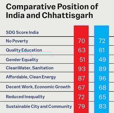 The Sustainable Development Solutions Network (SDSN), USA, released its 2024 report highlighting India’s improved global SDG ranking. India moved from 121st position in 2023 (score: 60.3) to 109th in 2024 (score: 64). Chhattisgarh’s contributions played a critical role in this national progress, reflecting the state’s dedication to sustainable practices.