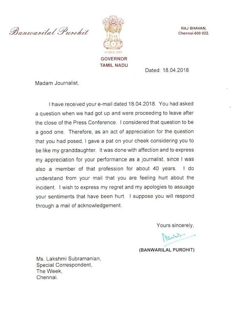 In a letter addressed on the Raj Bhavan letterhead to Lakshmi Subramanian of The Week, Purohit said: “I wish to express my regret and my apologies to assuage your sentiments that has been hurt.” He clarified that his gesture of patting her cheek was “merely an act of appreciation for the question you had posed and considering you to be me like my granddaughter.” “It was done with affection and to express my appreciation for your performance as a journalist since I was also a member of that profession for about 40 years.”