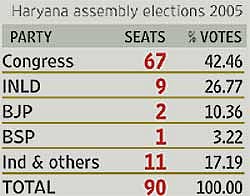 Haryana’s regional parties—the Indian National Lok Dal (INLD) led by Om Prakash Chautala and the newly formed Haryana Janhit Congress (HJC) led by Bhajan Lal—are going it alone. Chautala’s troubled alliance with the BJP broke down after the LS polls when the combine didn’t win a single seat. The party’s voteshare had dipped from 22.43 per cent in the 2004 general elections to 15.6 per cent. Chautala is further hobbled by a series of desertions, even at the senior level.