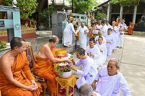 Tourists from Thailand during the celebration of the Songkran water festival, at Thai temple in Bodh Gaya.