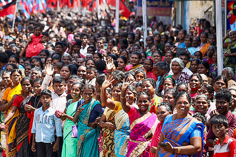 People during an election campaign of DMK candidate from Thoothukudi constituency Kanimozhi Karunanidhi ahead of the Lok Sabha polls, in Thoothukudi district.