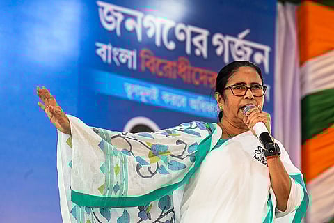 West Bengal Chief Minister and TMC chief Mamata Banerjee addresses a public meeting in support of party candidate Dev at Ghatal in Paschim Medinipur district.