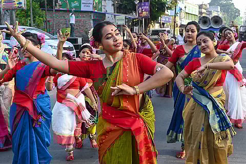 Members of a dance group perform on a road on International Dance Day, in Nadia.