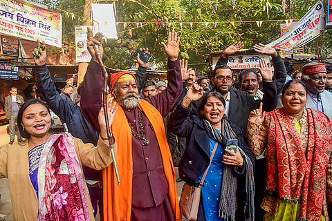 Hindu side people celebrate after a district court allowed Hindus to offer prayers in the southern cellar of the Gyanvapi mosque, in Varanasi.
