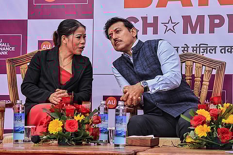 Rajasthan Sports Minister Rajyavardhan Singh Rathore with boxer Mary Kom during a press meet for AU Small Finance Bank's 'Bano Champion' programme, in Jaipur.
