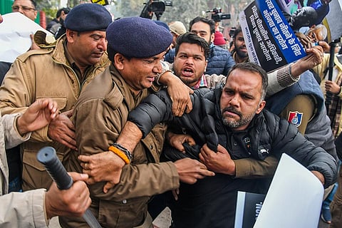 Police evict Youth Congress workers sitting on protest outside the Municipal Corporation office against alleged fraud in mayoral election, in Chandigarh.
