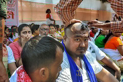 Members of Asomiya Yuva Mancha shave their heads during a protest against the Citizenship (Amendment) Act (CAA), in Guwahati.