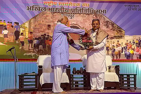 Rashtriya Swayamsevak Sangh (RSS) chief Mohan Bhagwat felicitates RSS 'Sarkaryavah' (general secretary) Dattatreya Hosabale after the latter was re-elected for the post by their Akhil Bharatiya Pratinidhi Sabha, in Nagpur.