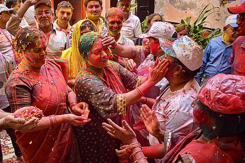 People play with colours on the eve of the festival of Holi, in Prayagraj.