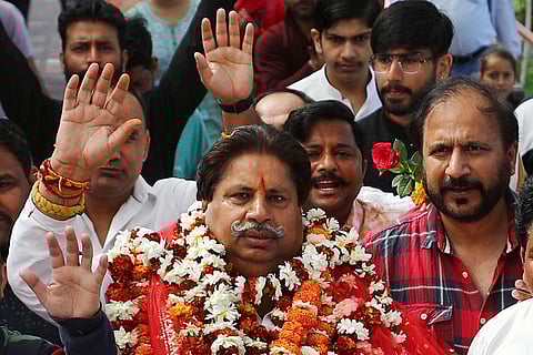 UP Congress chief and party candidate for Varanasi Lok Sabha seat Ajai Rai being welcomed by supporters on his arrival in Varanasi.