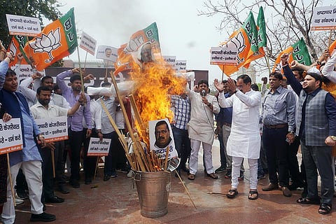 BJP leaders burn an effigy during a protest against Delhi Chief Minister and AAP Convenor Arvind Kejriwal, in New Delhi.