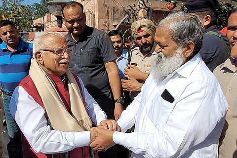 Former Haryana Chief Minister Manohar Lal Khattar greets BJP leader Anil Vij during the Holi festival at the latter’s residence, in Ambala.