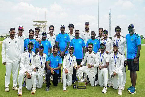 South Zone team pose with the runner up trophy after the Duleep Trophy 2025 final cricket match between South Zone and Central Zone, at the BCCI Centre of Excellence ground, in Bengaluru, Karnataka.