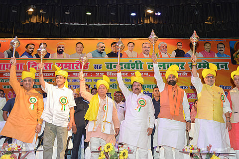 Bihar BJP President Dilip Jaiswal, Union Minister of State for Home Nityanand Rai, Union Minister Giriraj Singh, Bihar Deputy Chief Ministers Samrat Chaudhary and Vijay Kumar Sinha and others at the 'Chandravanshi Lalkaar Conference', in Patna.