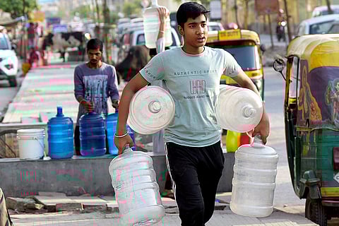 Locals collect free water being distributed at Kusumpur Pahari area of Vasant Vihar amid water crisis, in New Delhi.