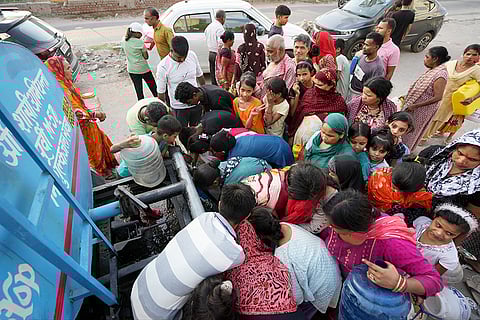 People collect drinking water from a tanker as the national capital faces a water crisis, at New Ashok Nagar area in New Delhi.