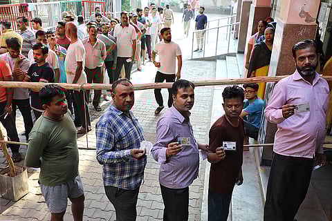 Voters line to cast their vote in the Tigaon area on the outskirts of Faridabad, Haryana on May 25, 2024, during the sixth phase of voting in India's general election.
