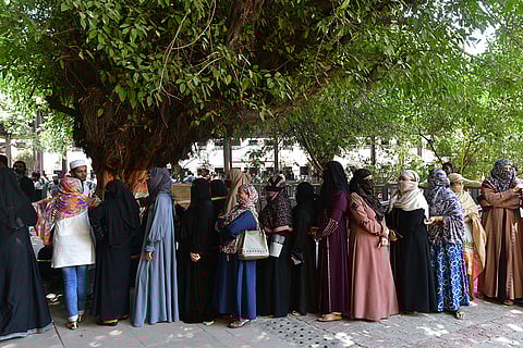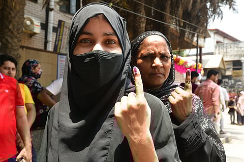 Muslim women in Jaffarbad outside the polling booth after casting the vote in East Delhi