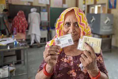 A woman displays her IDs and voter mark on her finger after casting her vote at a Polling Station in the Tigaon area of rural Faridabad in Haryana