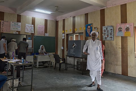 An elderly villager walks out from a polling booth after casting his vote in rural Faridabad, Haryana, during the sixth phase of voting in India's general election.