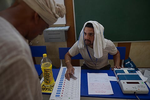 A polling officer explains the voting process to an elderly villager at a polling station in rural Faridabad, Haryana during the fifth phase of polling in the General Elections