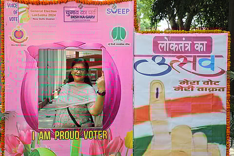 Voters posing at the makeshift selfie point at a South Delhi booth