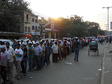 As we turned the corner, the crowd started growing, more groups of people shouting Vande Mataram, more flags, and we gradually reached first, the media entrance (which is also the exit from the maidan) and then another entrance through which some people were entering. We realized later that that entrance had probably been kept for those coming from India Gate, for by the time we left, there was an endless line outside that one too.