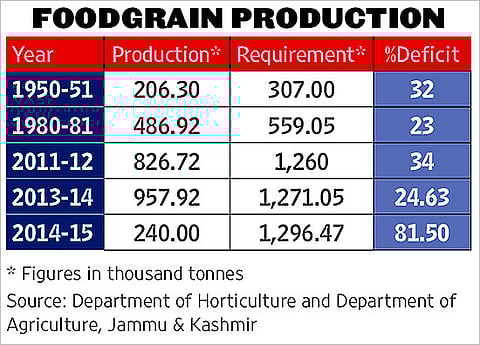 According to J&K consumer affairs minister Choudhary Zulfikar Ali, the state imports 7.51 lakh MT of rice from the Food Corporation of India (FCI) under the National Food Security Act and 5 lakh MTs from several states under various schemes. The state government doesn’t procure rice from the local farmers of Jammu and Kashmir as it is either for self-consumption or is sold to traders at higher than the government rates. Rice production in Kashmir division touched 5 lakh MT in 2008 and 5.61 lakh MT in 2011-12. And yet, Hunger in the Valley, a 2008 report by the Supreme Court commissioners, appointed to track hunger and the implementation of interim orders in the Right to Food case across the country, showed the food deficit going up in the state that used to produce a surplus until 1990-91. The deficit reached 35 per cent in 2000-01 and the upward trend has continued since.