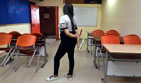 Going to the classroom after her college reopened, this girl is standing with all her grace. Maybe she has seen her college for the first time. The chairs are slanting against the table, awaiting undoing following a lively student chatter.