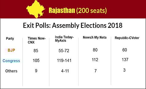 The majority mark in 200-assembly seat in Rajasthan is 100. In Rajasthan, exit polls predict a Congress win. India Today-MyAxis exit poll shows the Congress is likely to win 119-141 seats and BJP 55-72. TimesNow predicts 105 seats for Congress and 85 for BJP.