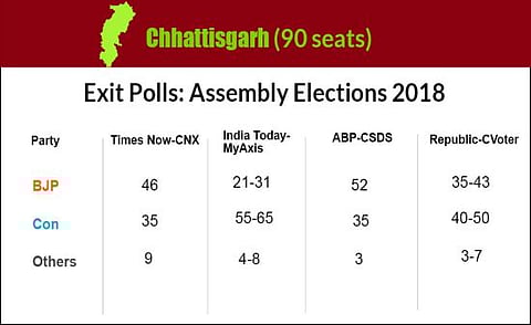 All the exit polls said the alliance of former chief minister Ajit Jogi's Janta Congress Chhattisgarh (Jogi) and the BSP may win between three and eight seats, which may help him to emerge as a king-maker in the event of a hung house.In Chhattisgarh, TimesNow-CNX exit poll gives a majority to BJP at 46, and the Congress 35. The India Today- My Axis poll, however, predicts the BJP will get 21-31 seats and the Congress will get 55-65 seats. The Republic TV-CVoter shows a close fight with BJP getting 35-43 seats and Congress getting 42-50 seats.