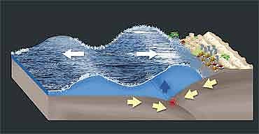 2. The Burma plate snaps, causing a massive displacement of water in the Indian Ocean. The waves, moving as fast as 800 km/h, spread out in all directions. In the deep ocean, the tsunami waves are very long, but they slow down and gain height as they hit shallow waters near the shores.