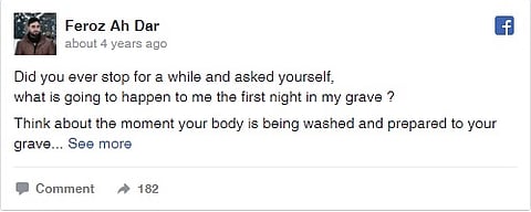 A 3-year-old Facebook post from slain Station House Officer(SHO) Feroz Ahmed Dar's timeline, lamenting about death and Kashmir’s turmoil, is doing the rounds on the social media.