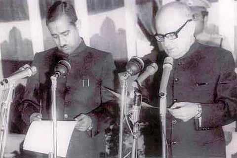 Virendra Kumar Sakhlecha (left) being sworn in as CM of Madhya Pradesh in 1978