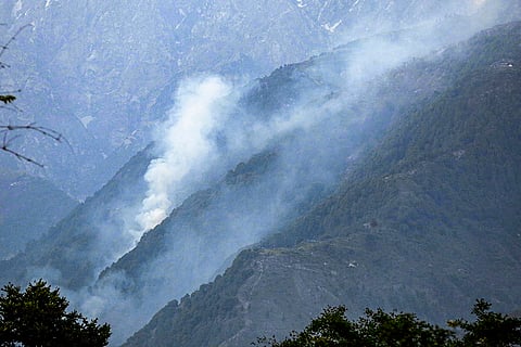 Smoke rises from a forest fire, in Uttarkashi district, Wednesday, May 29, 2024.