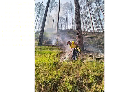 An SDRF personnel tries to extinguish a fire that broke out in a forest area, in Uttarkashi district, Friday May 31, 2024.