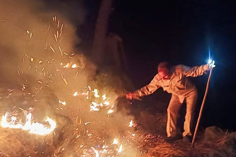 A Jammu and Kashmir Forest Protection Force personnel tries to extinguish a fire that broke out in Bathuni forest area, in Rajouri district, Sunday night, May 26, 2024.