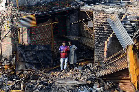 Owners of shops at tyre market inspect the remains of their shops in Gokulpuri area of North East Delhi on March 07, 2020. Tyre market was burnt down by rioters on 25th February during clashes between Hindu and Muslim community over CAA.