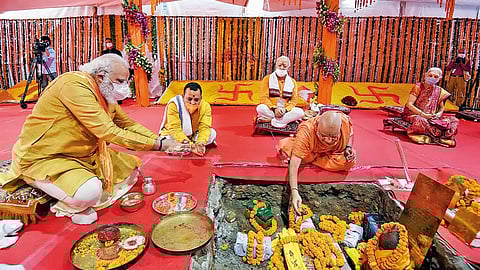 Modi, in a momentous event, lays the foundation stone for the Ram temple in Ayodhya. The ceremony marks a symbolic and historic milestone, signifying the beginning of the actual construction process.