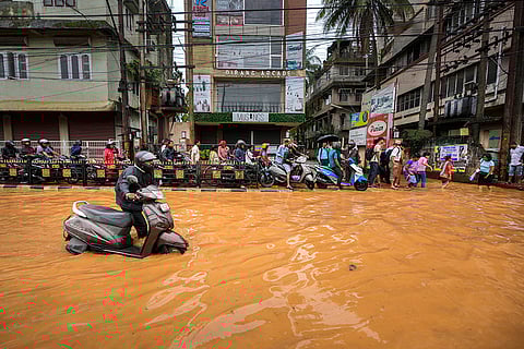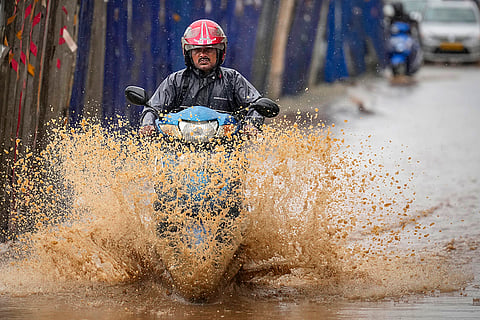 A person drives through a flooded street after heavy monsoon rains in Guwahati.