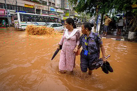 Women wade through a flooded street after heavy monsoon rains in Guwahati.