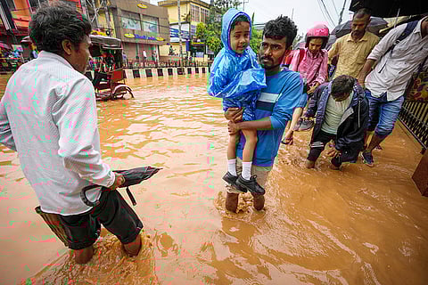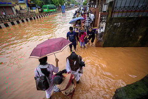 Commuters wade through a flooded street after heavy monsoon rains in Guwahati.