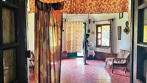 Since 1995, when he inherited this bungalow, Bablu Paswan has been trying to make sense of his inheritance of loss. The Potter Bungalow stands out. Yellow with sloping roofs and stained glass windows. Inside, the decay is pervasive. A photo hangs of Stanley Potter, a government employee. Next to it are his old hats.
