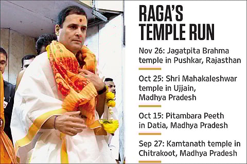 Congress president Rahul Gandhi chose the 14th-century temple of Brahma in Pushkar, Ajmer, in poll-bound Rajasthan, to furnish his Brahminical credentials—a Kaul Kashmiri Brahmin of Dattatreya gotra. It was done unobtrusively, almost naturally, during the course of a puja on November 26. Mere detail? A banal formality one encounters when, say, filling up a form? Well, not quite. The act spoke volumes, and eloquently. Culminating a series of public gestures, made in the backdrop of competing gestures, it framed a fundamental shift in India’s political climate. If one asks what the key difference is between the 2014 general election and the upcoming one, it could be this. ‘Congress vs BJP’ was once categorised, even if not very neatly, as ‘secular vs communal’. An overt touch of ‘Hindu vs Hindutva’ has now coloured that equation. The Congress offers a nuanced gradation there, but it’s a risky tactic that seems to be setting off a domino effect—with unforeseen consequences.