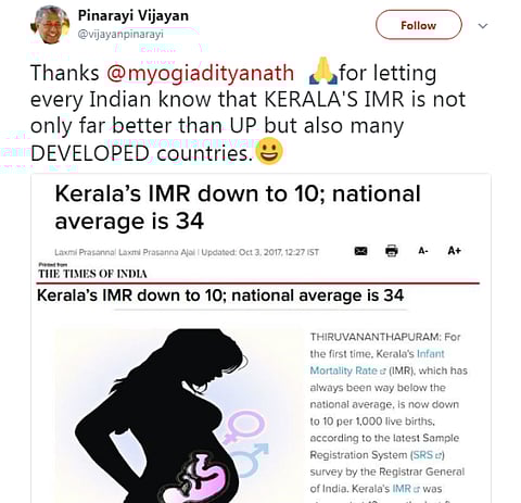 The CM also took potshots at UP's declining heathcare, quoting the same news to say, "Kindly correct yourself Shri Adityanath, Kerala's Infant Mortality Rate is 10. National average 34, Uttar Pradesh's 43."