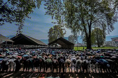 NC president Farooq Abdullah and vice president Omar Abdullah take part in the Eid-al-Fitr celebrations, at Hazratbal Shrine, in Srinagar.
