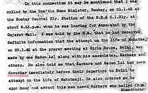 Godse’s lengthy missive was written after Savarkar became the Hindu Mahasabha president. To quote from Godse’s letter: "Since the time you were released from your internment at Ratnagiri, a divine fire has kindled in the minds of those groups who profess that Hindustan is for the Hindus; and by reason of the pronouncement which you made upon accepting the presidentship of the Hindu Mahasabha confidence is felt that hope will materialise into a reality." Godse also mentioned that "we should have a National Volunteer Army" and 50,000 volunteers of the RSS were ready and waiting. Godse goes on to implore Savarkar to guide those fighting for the Hindu cause. Jamshed Nagarvala, deputy commissioner of police, special branch, Bombay, who conducted the investigations into the conspiracy, in his report noted, "Godse was devoted to Savarkar’s political ideology since 1935. He (Godse) opened the RSS branch in Ratnagiri in 1930."