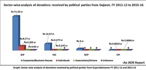 The Bharatiya Janta Party (BJP) in Gujarat received donations over four times than that of all the other five national parties combined between 2011-12 and 2015-16, revealed a report compiled by Association for Democratic Reforms (ADR).