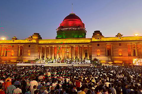 People watch as Narendra Modi is sworn-in as the Prime Minister of India by President Droupadi Murmu at the Rashtrapati Bhawan, in New Delhi.