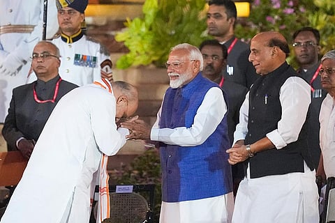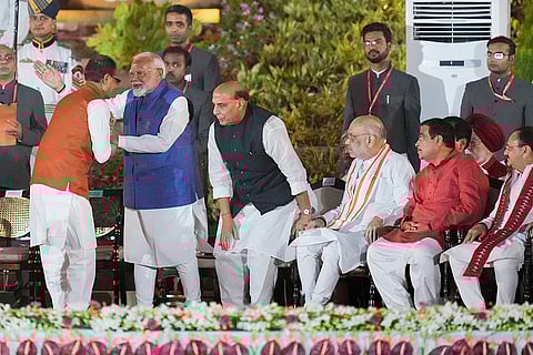 Prime Minister Narendra Modi being greeted by BJP MP Shivraj Singh Chouhan at the swearing-in ceremony of the new union government, at Rashtrapati Bhavan in New Delhi.